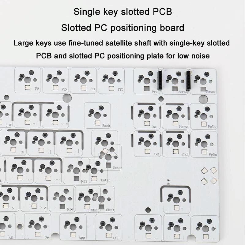 3. Single key slotted PCB slotted, PC positioning plate: large keys use fine-tuned satellite shaft with single key slotted PCB and slotted PC positioning plate, low noise when tapping
