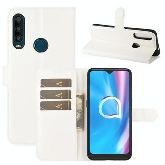 Προστατευτική θήκη τύπου βιβλιαρίου με υφή λύτσι για Alcatel 1SE 2020, με βάση στήριξης, θήκες για κάρτες και πορτοφόλι (Λευκό)