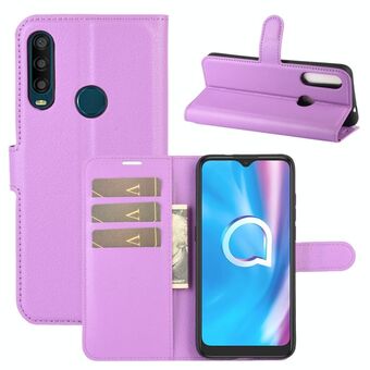 Προστατευτική θήκη τύπου βιβλιαρίου με υφή δέρματος λύτσι για Alcatel 1SE 2020 με βάση στήριξης, υποδοχές καρτών και θήκη πορτοφολιού (Μωβ)