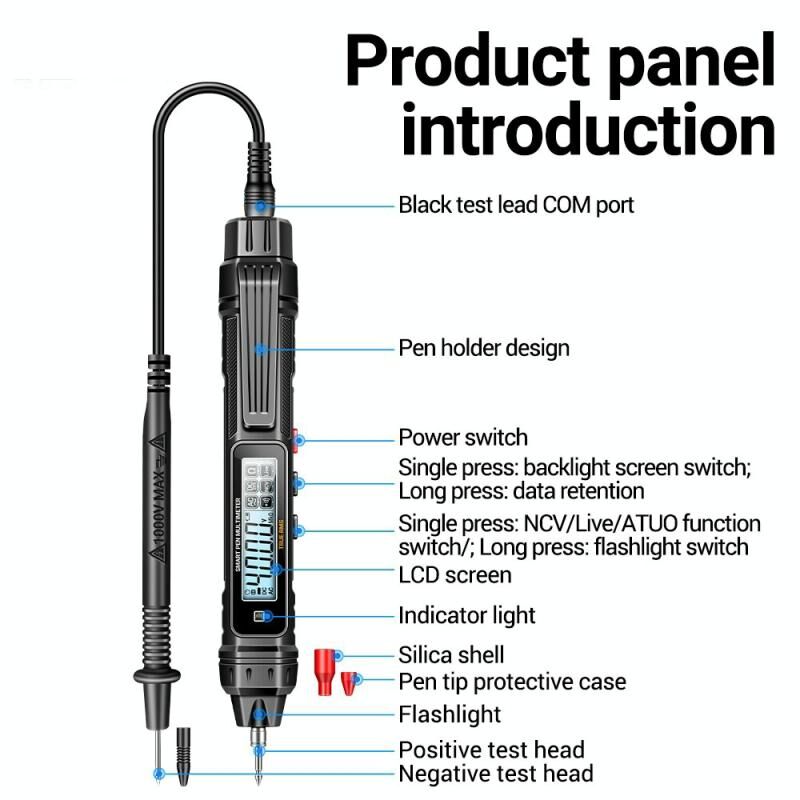 7. Intelligent identification of neutral and live wires: Select the function of distinguishing live neutral and live wires, insert the pen needle into the hole for identification, no need for traditional contact measurement methods, and it is safer to measure electricity