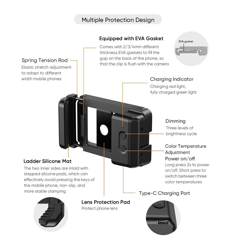 2. Multifunctional mobile phone holder with novel overall appearance. One end of the mobile phone holder has a cold shoe expansion slot, and the back is composed of 40 lamp beads and a built-in high-capacity 350mAh rechargeable lithium battery as a fill light. Three levels of brightness and three colors of fill light to meet the atmosphere fill light needs of different scenes