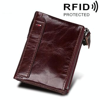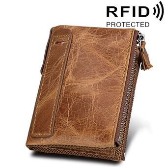 Genuine Cowhide Leather Crazy Horse Texture Dual Zipper Short Style Card Holder Wallet RFID Blocking Card Bag Protect Case for Men, Size: 12.1*9.4*2.7cm(Coffee)