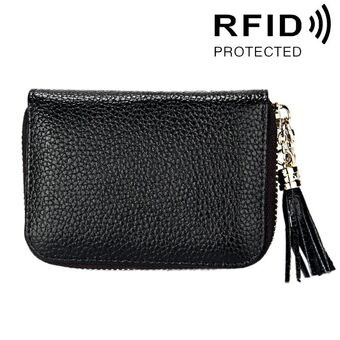 Genuine Cowhide Leather Solid Color Zipper Card Holder Wallet RFID Blocking Card Bag Protect Case Coin Purse with Tassel Pendant & 15 Card Slots for Women, Size: 11.1*7.6*3.5cm(Black)