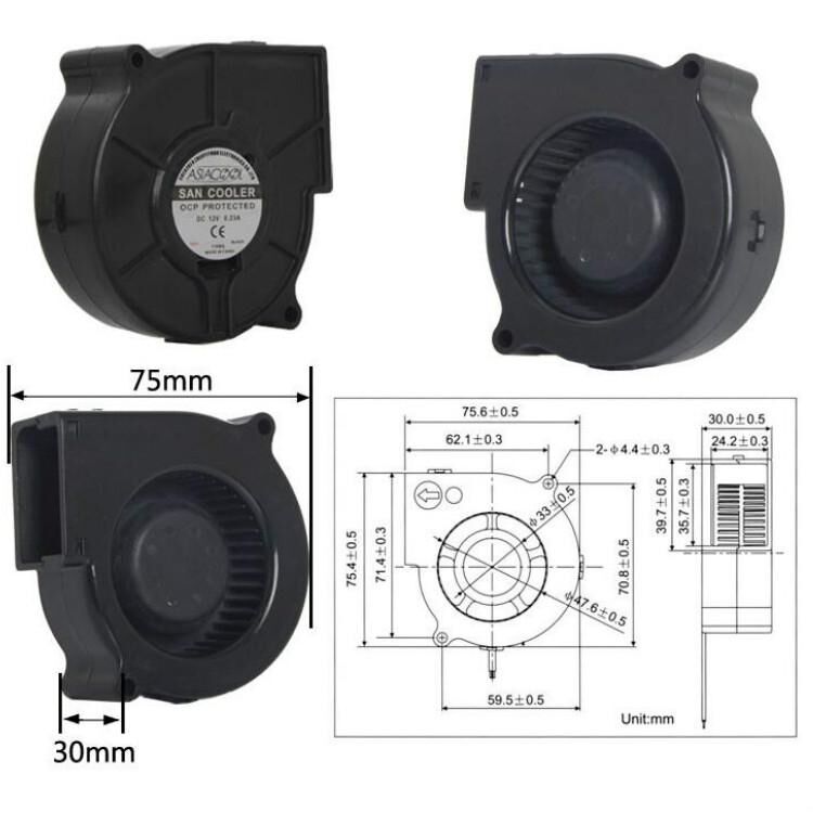 2. 7530: Βάρος 69 γραμμάρια, μέγεθος 75x75x30 χιλ., τάση λειτουργίας DC 12V, ονομαστικό ρεύμα 0,23A, τύπος ρουλεμάν λιπαντικό ρουλεμάν, τύπος ακροδέκτη 2.54-2P