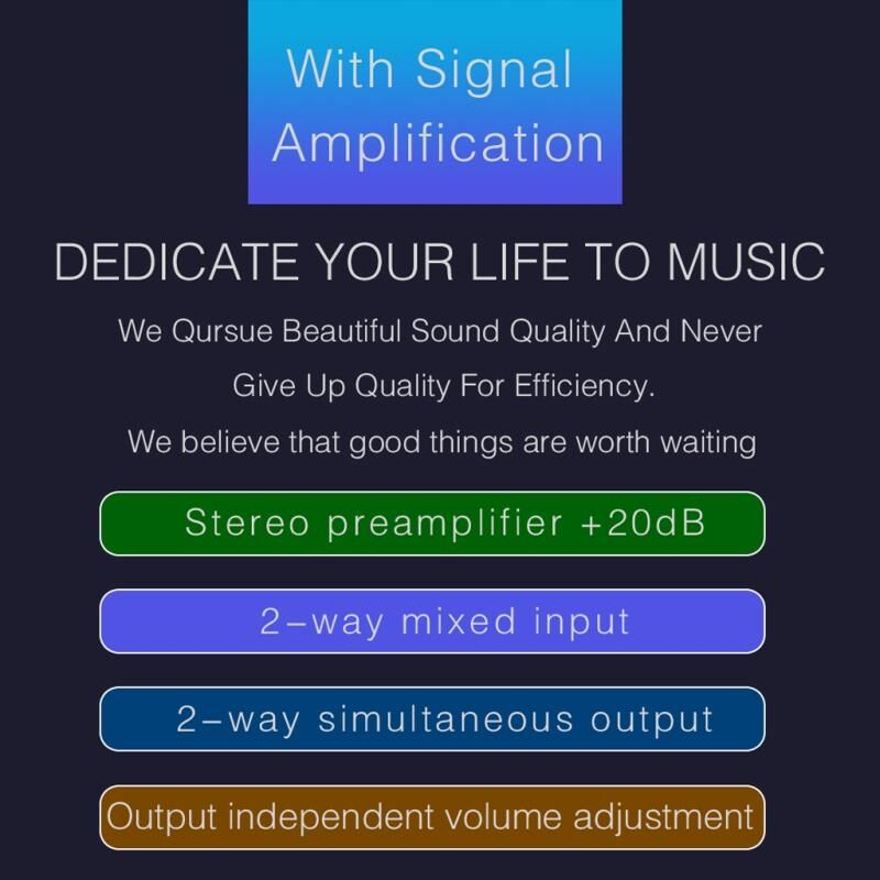 Ένας ισχυρός ενισχυτής σήματος ή έλεγχος έντασης, ίσως χρειαστείτε ένα μακρύ καλώδιο σύνδεσης ήχου τηλεόρασης και του δέκτη στην άλλη πλευρά του δωματίου για να παρέχετε υψηλή απολαβή μέσω οποιασδήποτε πηγής σήματος στάθμης γραμμής, επιτρέποντας μεγαλύτερη λειτουργία καλωδίου ή απαιτώντας “buffer” για να ενισχύσετε τη χαμηλότερη ένταση. Μπορείτε να το χρησιμοποιήσετε μεταξύ της πηγής σήματος στάθμης γραμμής και του ενισχυτή ισχύος ως ενισχυτή σήματος, η θύρα 3,5mm + RCA ταιριάζει σχεδόν με όλες τις διεπαφές προϊόντων.