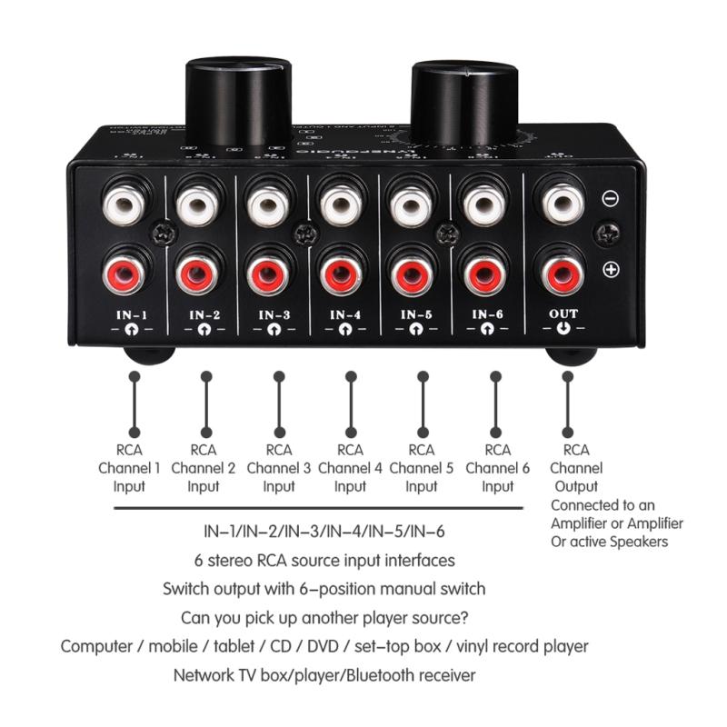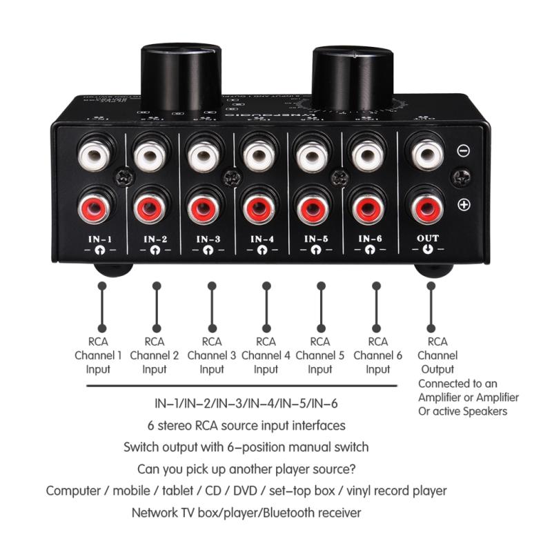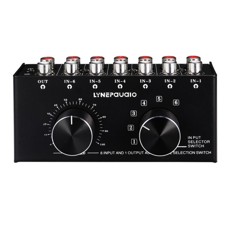 1 X 6 input 1 output stereo audio signal selection switcher, output volume adjustment RCA port