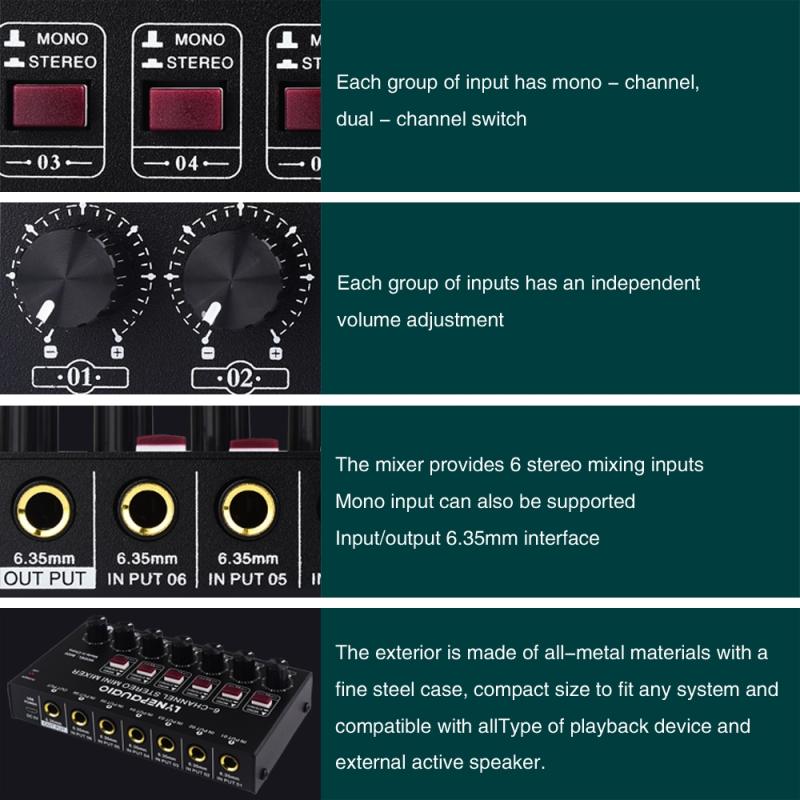 11. Number of input channels: 6 groups of stereo input (support 6.35mm mono or dual channel stereo mixed input at the same time)