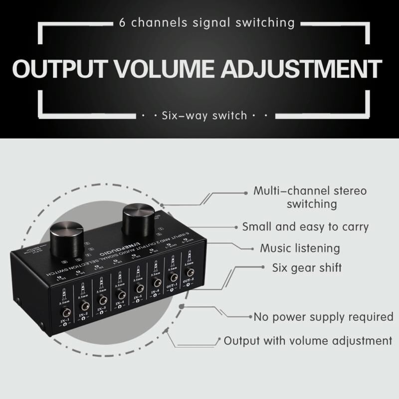 Το προϊόν χρησιμοποιεί τυπικό σχεδιασμό διεπαφής 3,5mm για είσοδο και έξοδο και χρησιμοποιεί ακριβή χειροκίνητο διακόπτη 6 επιπέδων και 2 επιπέδων για τον επιλογέα,