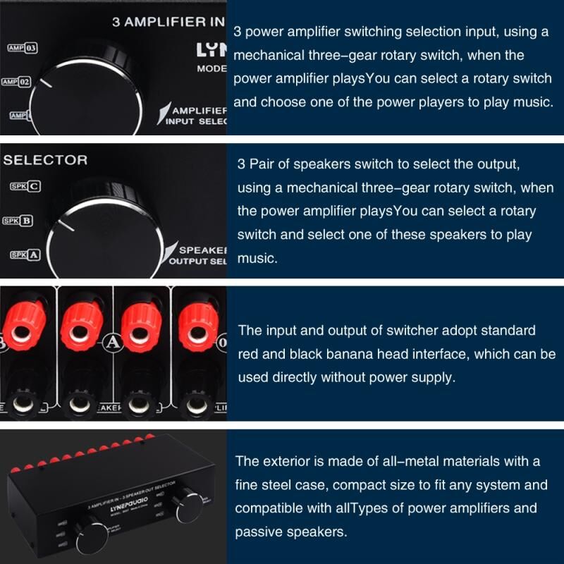 1. 3 power amplifiers rotary gear switches select to switch inputs,