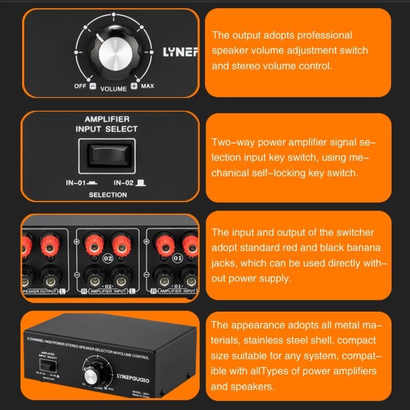 2. Έλεγχος ενισχυτή AMPC: Ο διακόπτης ηχείων δύο καναλιών ελέγχει τη στερεοφωνική σύνδεση μεταξύ δύο ενισχυτών και ενός σετ ηχείων ή την επιλογή διακόπτη συνδυαστικής σύνδεσης, την είσοδο/έξοδο μέσω των ακροδεκτών σύνδεσης βιδωτού τύπου, οι οποίοι δέχονται καλώδιο ηχείων 14AWG.