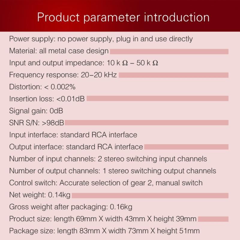 4. RCA interface design is used for product input and output standards, and the switch is designed with manual push-button switch of precise 2 positions.