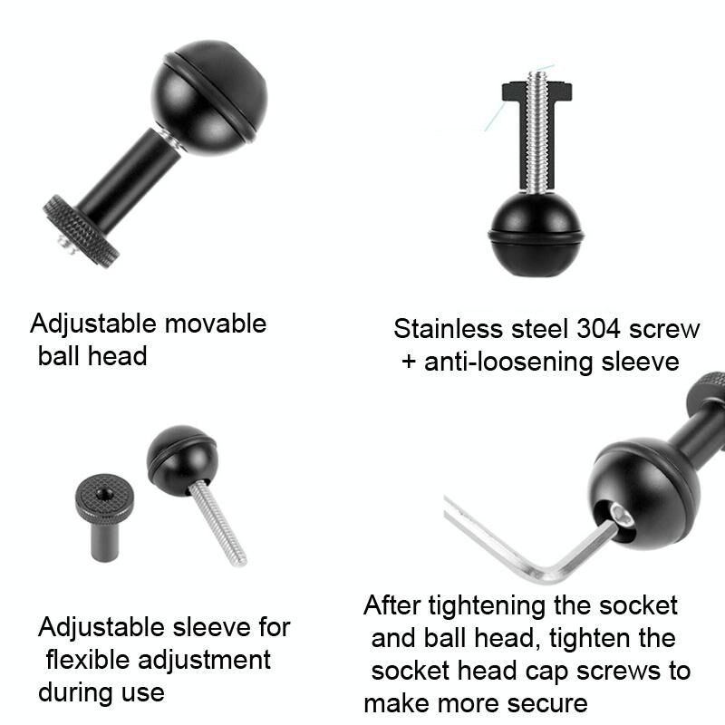 1. Η βίδα της σφαιρικής κεφαλής είναι κατασκευασμένη από ανοξείδωτο χάλυβα, η σκληρότητα και η αντοχή στη διάβρωση έχουν ενισχυθεί σημαντικά και δεν θα υπάρχει πρόβλημα θραύσης του προϊόντος. 2. Το μήκος της βίδας μπορεί επίσης να ρυθμιστεί. Όταν συναντάτε μια ρηχή οπή βίδας, σφίξτε το κινητό χιτώνιο δεξιόστροφα και στη συνέχεια χρησιμοποιήστε ένα εξάγωνο κλειδί για να ενισχύσετε τη βίδα. Το κάτω μέρος του κυλίνδρου είναι σχεδιασμένο με ένα αντιολισθητικό ελαστικό μαξιλαράκι, ακόμα και αν η σφαιρική κεφαλή είναι κλειδωμένη ελάχιστα, μπορεί να είναι σταθερή, έτσι ώστε να λυθεί το πρόβλημα θραύσης που προκαλείται από το χαλάρωμα της σφαιρικής κεφαλής κατά τη χρήση και το πρόβλημα ότι η ρηχή οπή βίδας δεν μπορεί να κλειδωθεί. 3. Διαδικασία: κατεργασία CNC, ανοδίωση, λεπτή αμμοβολή, άνετη αίσθηση στο χέρι. 4. Υλικό: κράμα αλουμινίου + ανοξείδωτος χάλυβας 304 + σιλικόνη. 5. Διαστάσεις: Μήκος 57mm, διάμετρος σφαίρας 1 ίντσα. 6. Βάρος: 48 γραμμάρια.