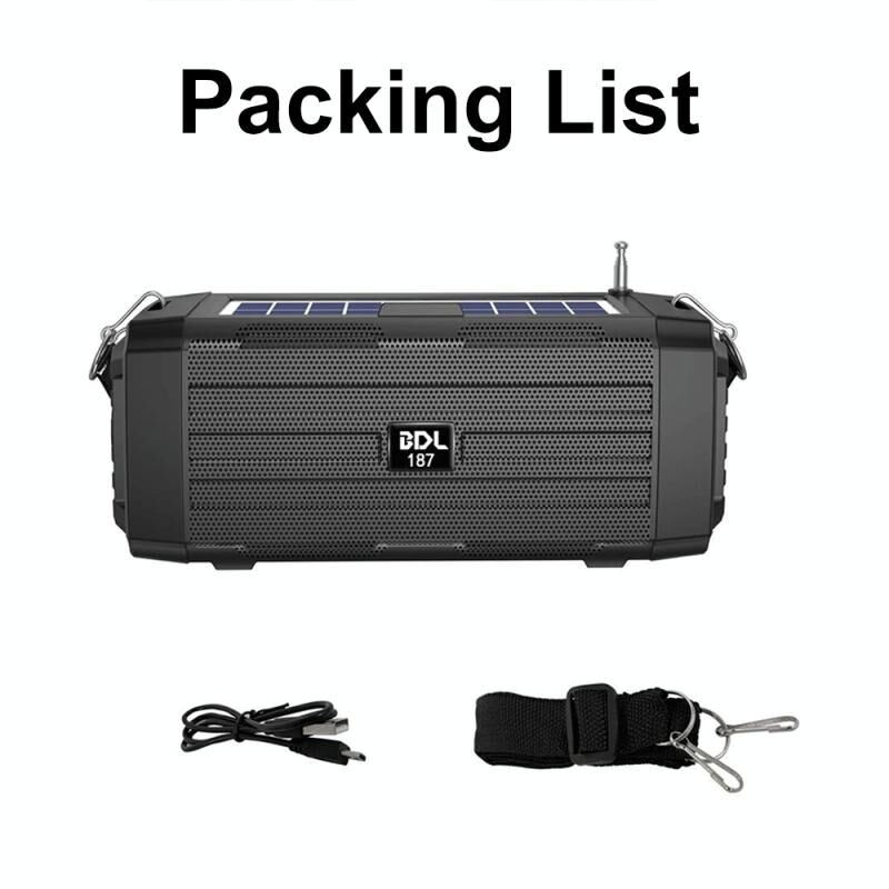 Χαρακτηριστικά: 1. Πολλαπλές λειτουργίες αναπαραγωγής, Bluetooth/TF κάρτα/U δίσκος μπορούν να αλλάζουν ανάλογα με τις ανάγκες 2. Διπλά ηλιακά πάνελ στην κορυφή καθιστούν τη φόρτιση πιο εύκολη 3. Σχεδιασμός φακού στην πλευρά καθιστά τον φωτισμό σε εξωτερικούς χώρους πιο βολικό 4. Η κεραία είναι κατασκευασμένη από υλικά υψηλής ποιότητας, με ισχυρότερα σήματα, περισσότερα κανάλια αναζήτησης και πιο σταθερά σήματα 5. Υιοθετείται η έκδοση Bluetooth 5.0, η οποία είναι συμβατή με όλες τις έξυπνες συσκευές όπως κινητά τηλέφωνα/τάμπλετ, με γρήγορη ταχύτητα σύνδεσης, χαμηλότερη κατανάλωση ενέργειας και σταθερή μετάδοση 6. Εξοπλισμένο με ιμάντες ώμου, που το καθιστούν πιο εύκολο στη μεταφορά Παράμετροι προϊόντος: 1. Υλικό: πλαστικό, μέταλλο 2. Λειτουργία: εισαγωγή κάρτας, φωτισμός, λειτουργία κλήσης, ραδιόφωνο, μετάδοση, ηχείο Bluetooth 3. Έκδοση Bluetooth: 5.0 4. Αποτελεσματική απόσταση: 10 μέτρα 5. Εύρος απόκρισης συχνότητας: 100HZ-20KHZ 6. Λόγος σήματος προς θόρυβο: 95dB 7. Αριθμός ηχείων: 1 8. Προδιαγραφές ηχείου: 52mm 9. Χωρητικότητα μπαταρίας: 1200mAh 10. Τάση φόρτισης: 5V 11. Μέγεθος προϊόντος: 200 x 74 x 87mm 12. Καθαρό βάρος: 477g Λίστα συσκευασίας: -Ηχείο Bluetooth x 1 -Καλώδιο φόρτισης x 1 -Ιμάντας μεταφοράς x 1