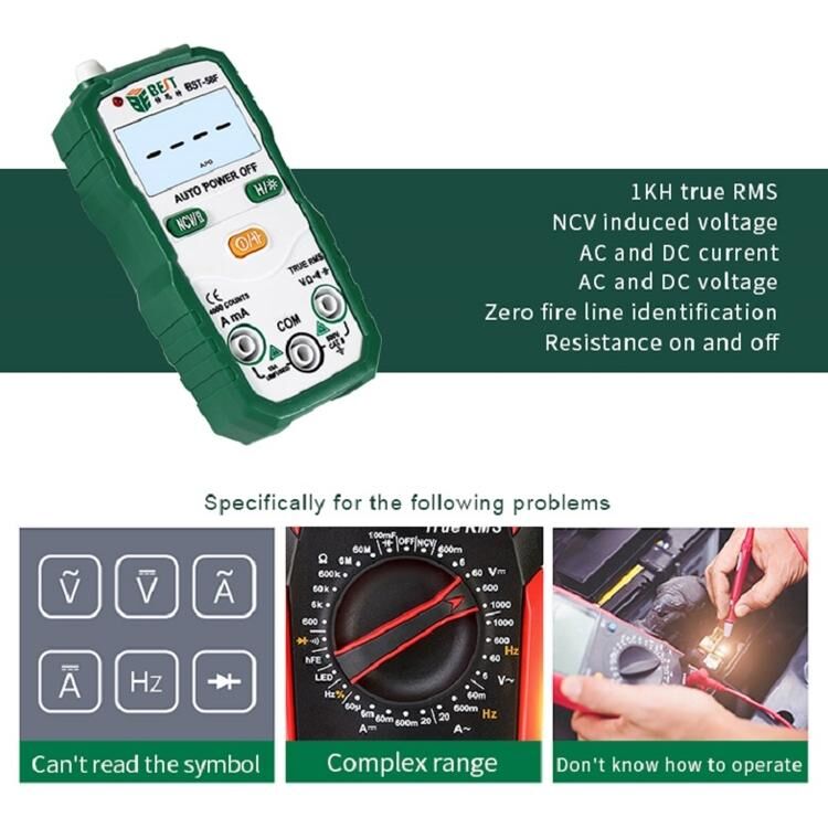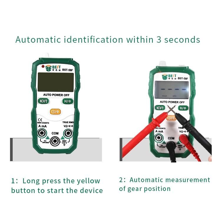 1. Αυτόματη αναγνώριση με ένα πλήκτρο: Αληθινή αποτελεσματική τιμή 1kh, επαγόμενη τάση NCV, ρεύμα AC και DC, τάση AC και DC, αναγνώριση γραμμής μηδενικού πυρός και ενεργοποίηση/απενεργοποίηση αντίστασης