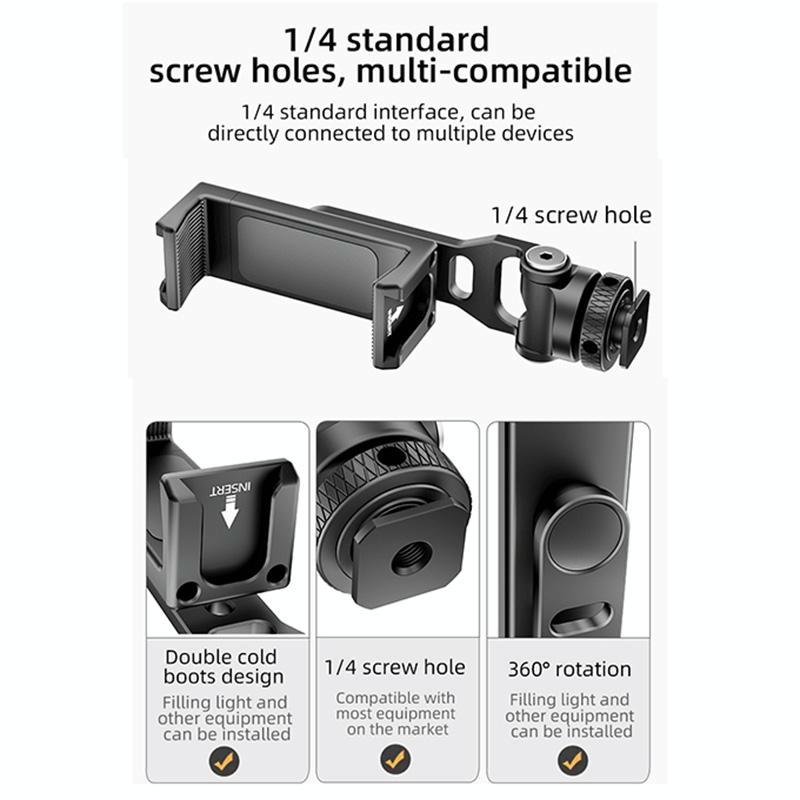 3. With 1/4 inch screw holes on the bottom and back, can be mounted on selfie pole, tripod, stabilizer, video slider & alike for professional smartphone video shooting.