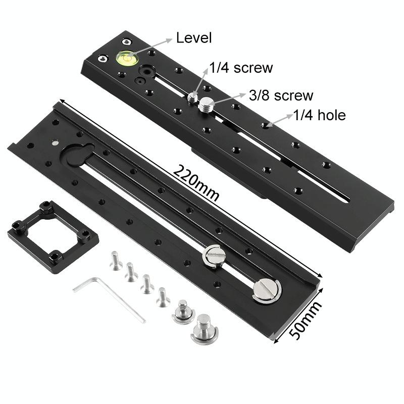 5. The plate measures 220mm lengthquick release plate to provide additional leverage for larger cameras and provide more room for mounting optional components, such as a rod mount for a follow focus motor, zoom motor, or lens support.