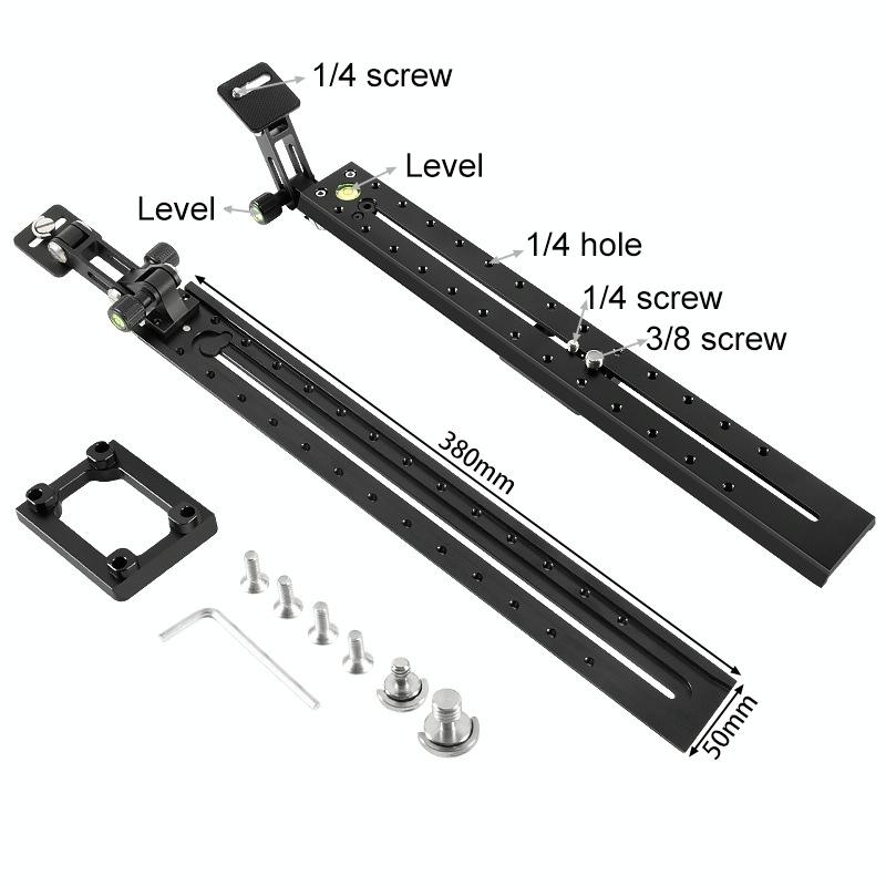 5. The plate measures 380mm lengthquick release plate to provide additional leverage for larger cameras and provide more room for mounting optional components, such as a rod mount for a follow focus motor, zoom motor, or lens support.