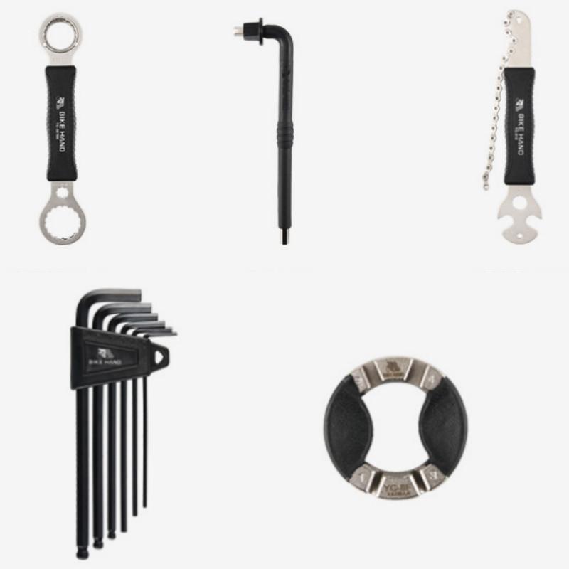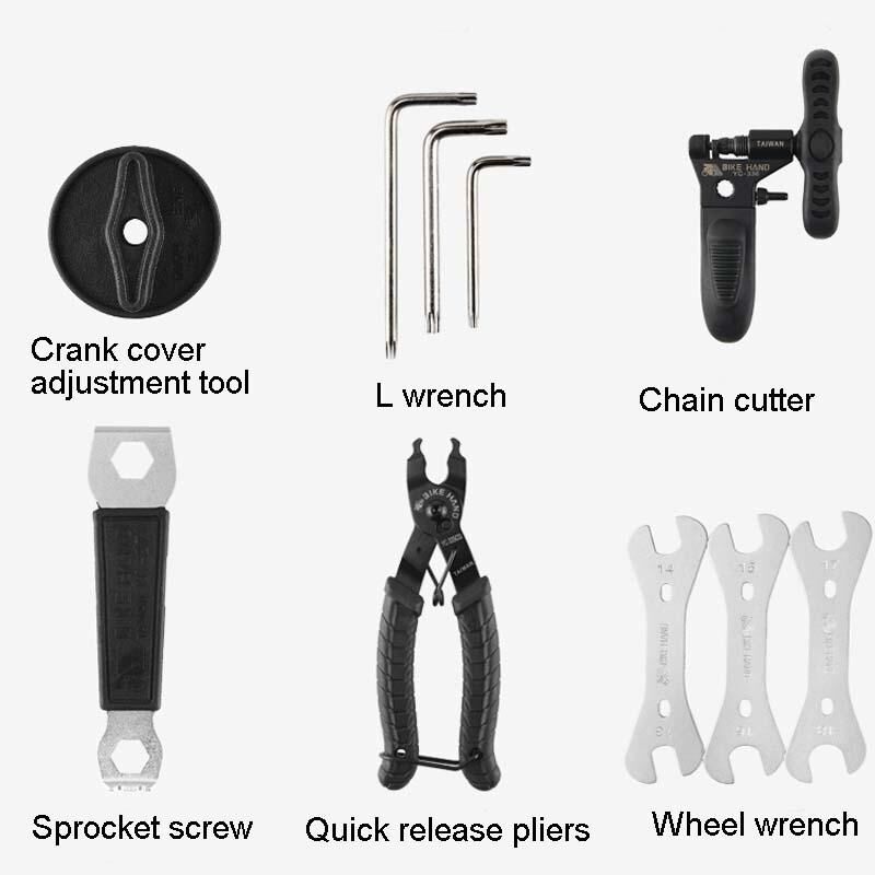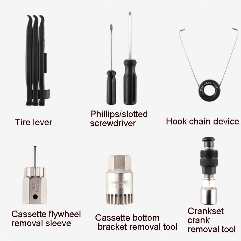 5. Περιλαμβάνει εργαλεία: εργαλείο αφαίρεσης μεσαίας τριβής, L-σχήμο κλειδί, εργαλείο αφαίρεσης στροφάλου, εργαλείο ρύθμισης καλύμματος στροφάλου, L-σχήμο κλειδί, κόφτης αλυσίδας, βίδα δίσκου αλυσίδας, γρήγορη πένσα απελευθέρωσης, κλειδί κέντρου, μοχλός ελαστικού, κατσαβίδι σταυρωτό/ίσιο, συσκευή αγκίστρωσης αλυσίδας, μανίκι αφαίρεσης κασέτας, εργαλείο αφαίρεσης άξονα κασέτας, εργαλείο αφαίρεσης στροφάλου αλυσίδας, 6 προδιαγραφές εσωτερικού εξαγώνου, ρυθμιστής καλωδίου