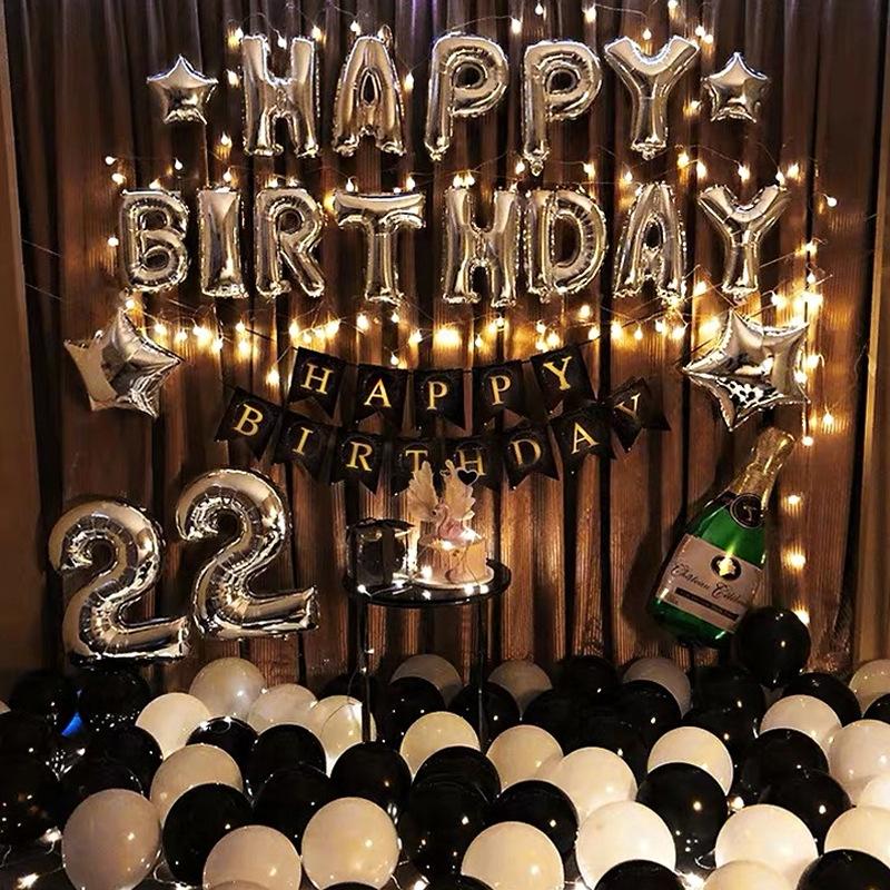 12. Package one includes: a set of 16-inch happy birthday silver letters, a large wine bottle, 2 18-inch silver five-pointed stars, 2 10-inch silver five-pointed stars, 34-inch large number 22 (replaceable), black bronzing A set of birthday fishtail flags, 12-inch matte balloons, 20 white and black each