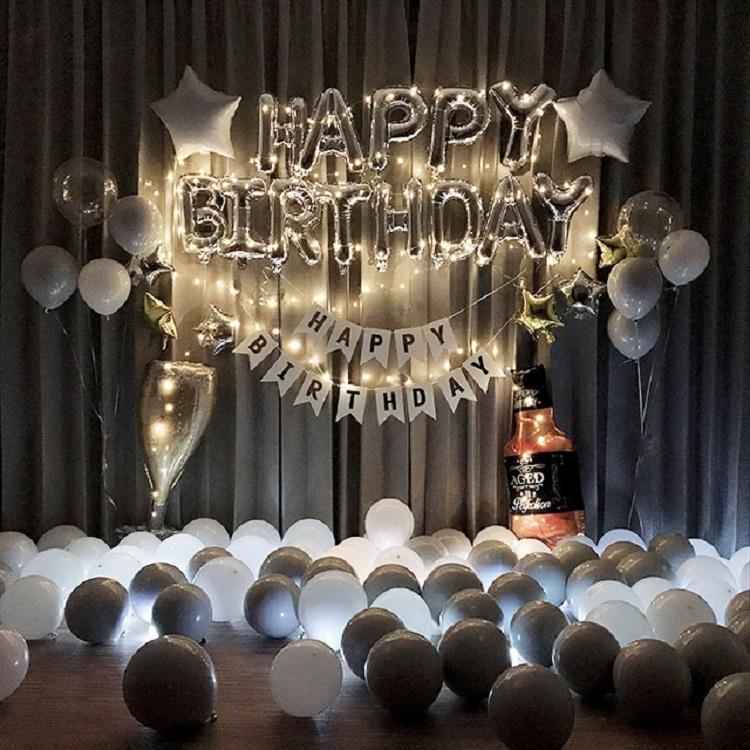 13. Package two includes: a set of 16-inch happy birthday silver letters, a large wine bottle and a wine glass, two 18-inch white five-pointed stars, three 10-inch silver and three golden five-pointed stars, two gold sequined balloons, birthday A set of fishtail flags, 12-inch matte balloons, 20 white and gray each
