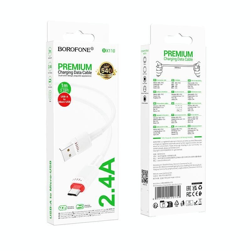 Borofone BX110 Beneficio 2.4A USB to Micro USB Charging Data Cable, Length: 1m(White) (Borofone)