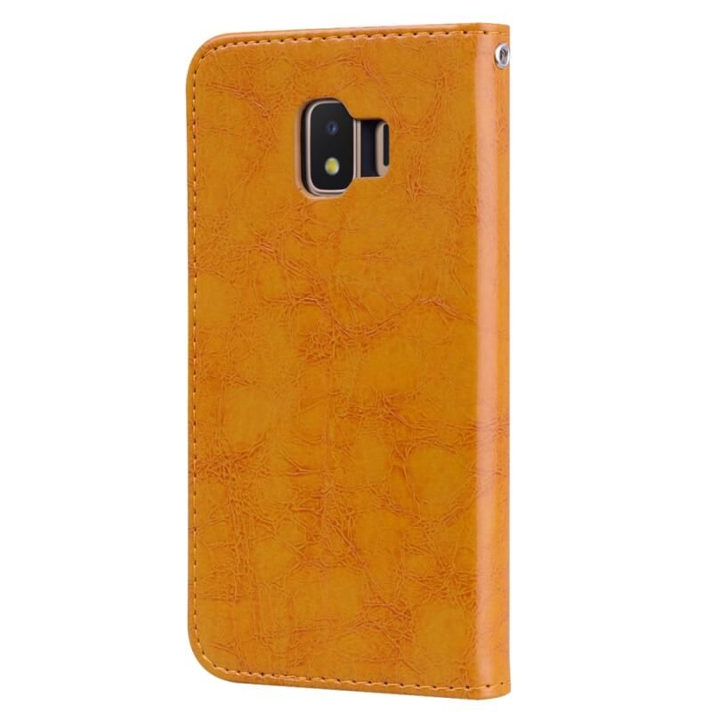 Business Style Oil Wax Texture Horizontal Flip Leather Case για Galaxy J2 Core, με θήκη & υποδοχές για κάρτες & πορτοφόλι (καφέ)