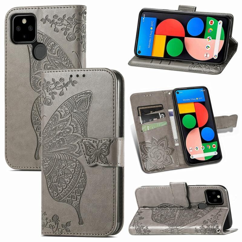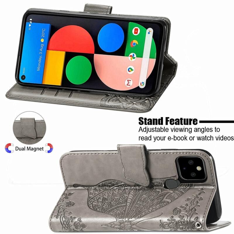 Θήκη δέρματος οριζόντιας αναδίπλωσης με ανάγλυφο σχέδιο πεταλούδας, λουλούδια, βάση στήριξης, θήκες για κάρτες, πορτοφόλι και λουρί για Google Pixel 5A 5G (Μαύρο)
