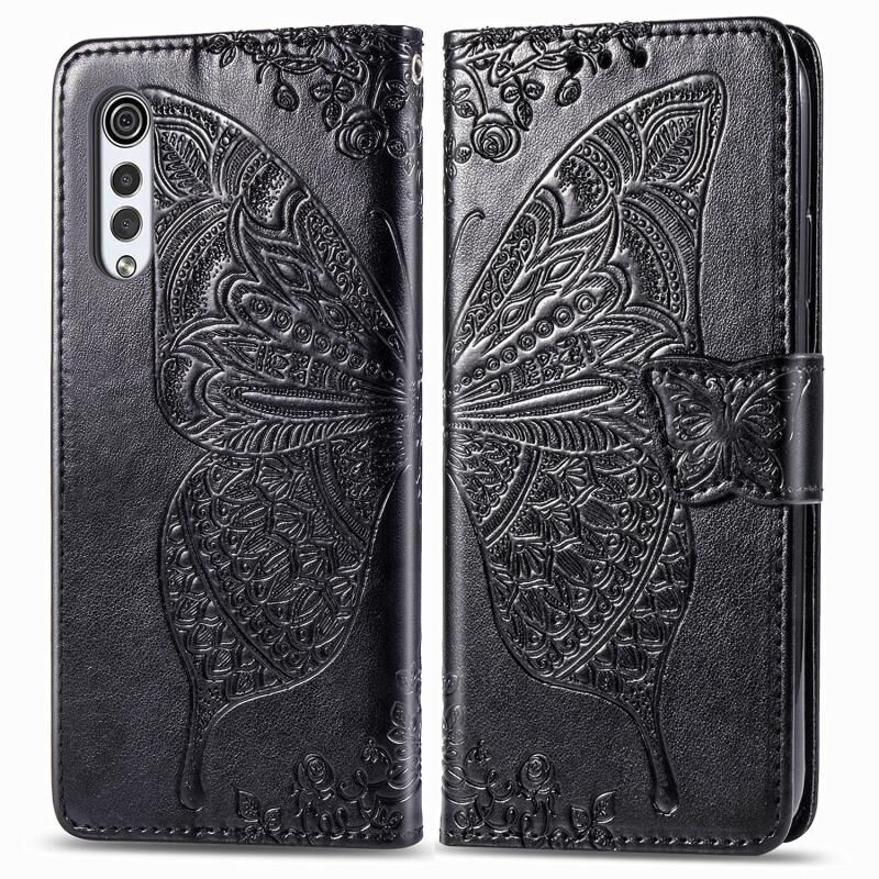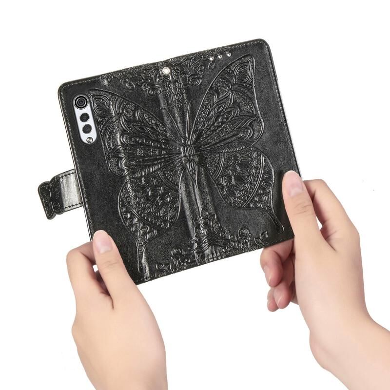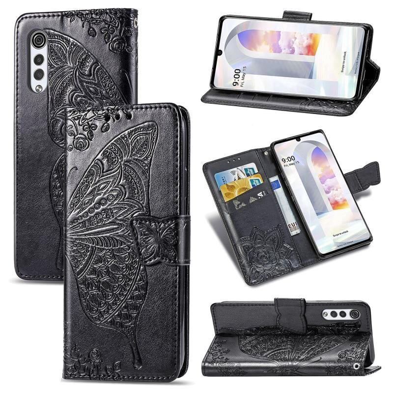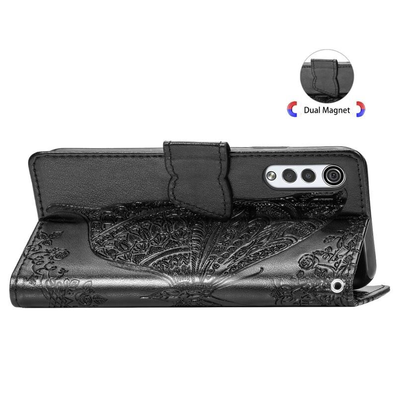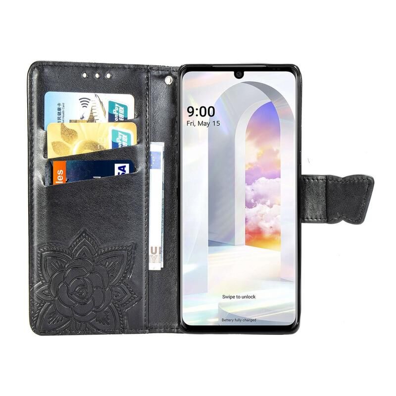 Θήκη δέρματος οριζόντιας αναδίπλωσης με ανάγλυφο σχέδιο πεταλούδας, λουλούδια, βάση στήριξης, θήκες για κάρτες, πορτοφόλι και λουρί για LG Velvet 2 Pro (Μαύρο)