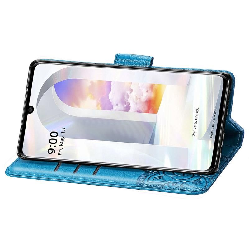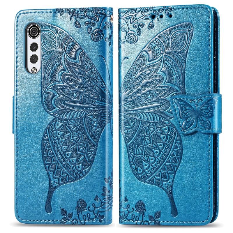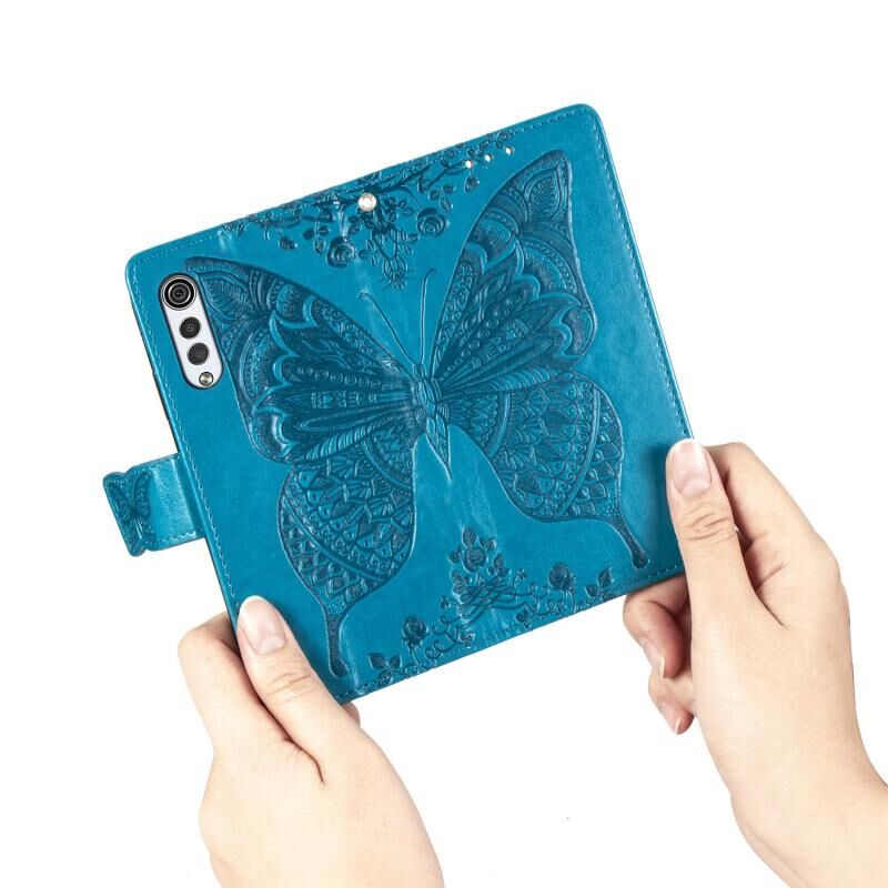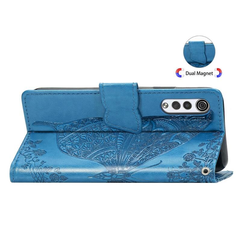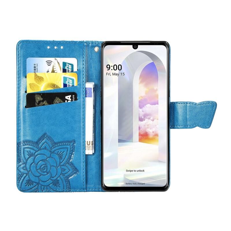 Θήκη δέρματος οριζόντιας αναδίπλωσης με ανάγλυφο σχέδιο πεταλούδας, λουλούδια, βάση στήριξης, θήκες για κάρτες, πορτοφόλι και λουρί για LG Velvet 2 Pro (Μαύρο)
