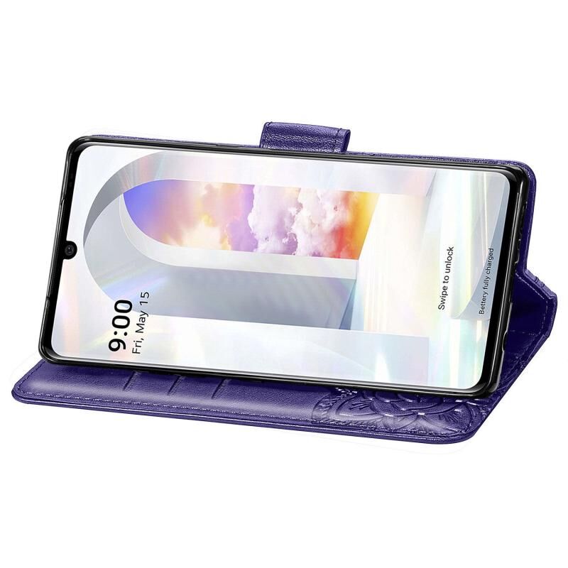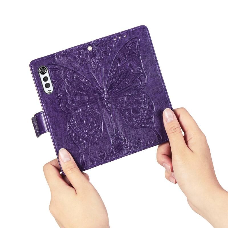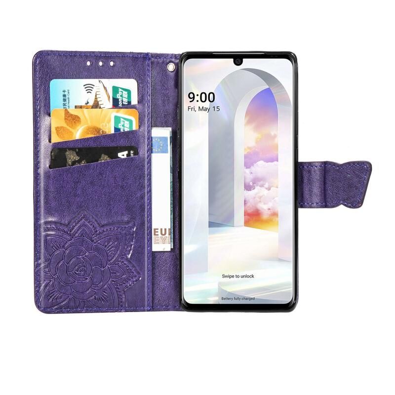 Θήκη δέρματος οριζόντιας αναδίπλωσης με ανάγλυφο σχέδιο πεταλούδας, λουλούδια, βάση στήριξης, θήκες για κάρτες, πορτοφόλι και λουρί για LG Velvet 2 Pro (Μαύρο)