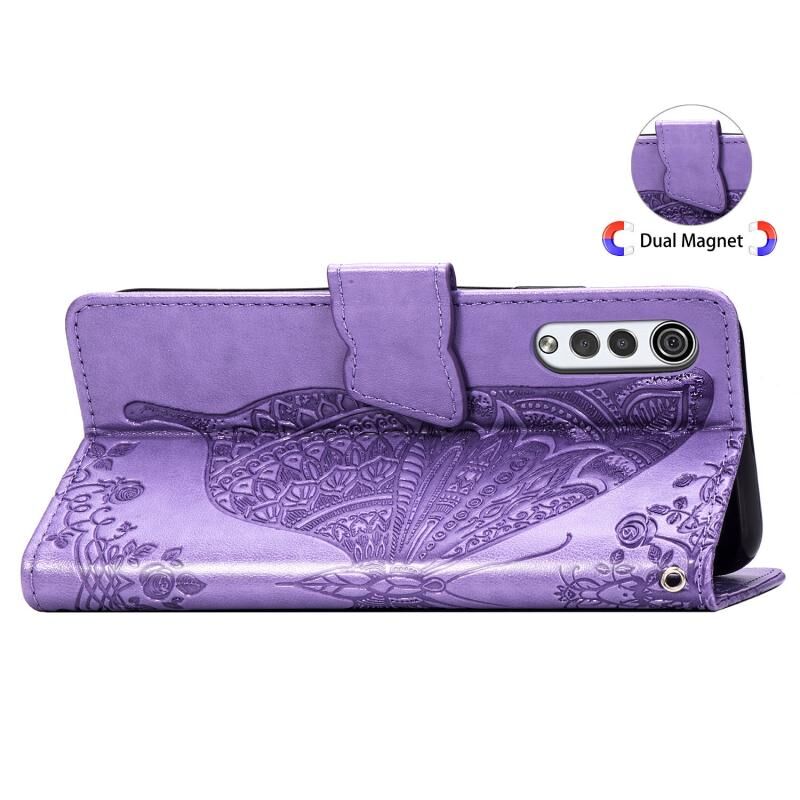 Θήκη δέρματος οριζόντιας αναδίπλωσης με ανάγλυφο σχέδιο πεταλούδας, λουλούδια, βάση στήριξης, θήκες για κάρτες, πορτοφόλι και λουρί για LG Velvet 2 Pro (Μαύρο)