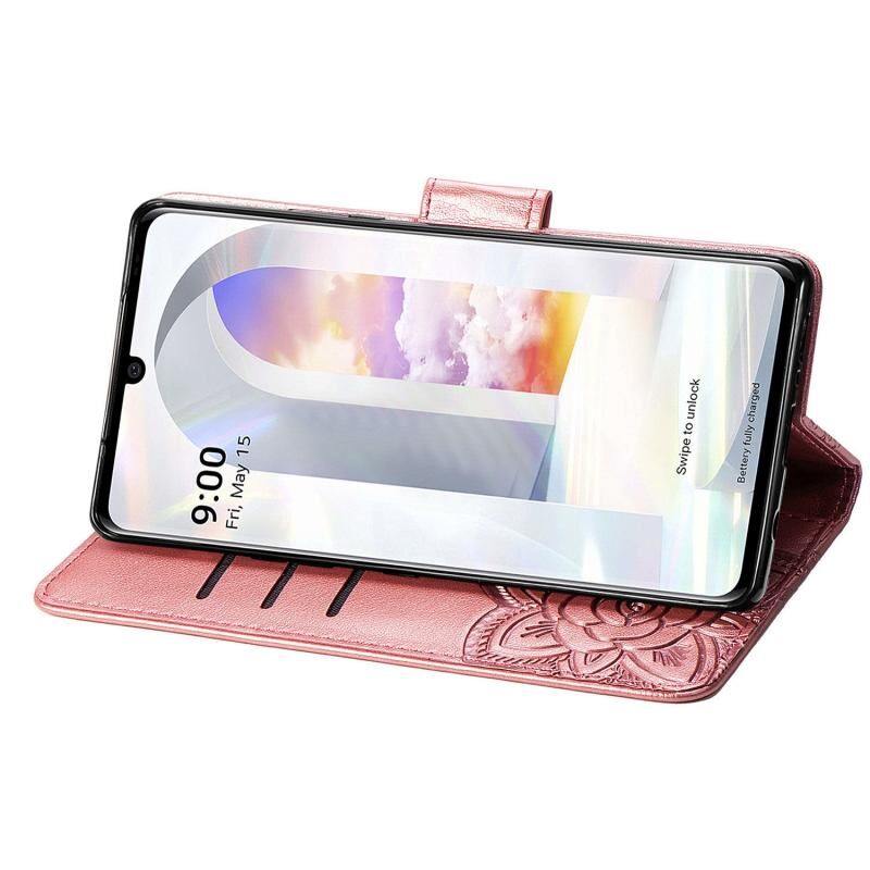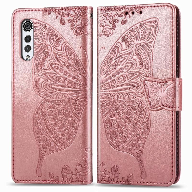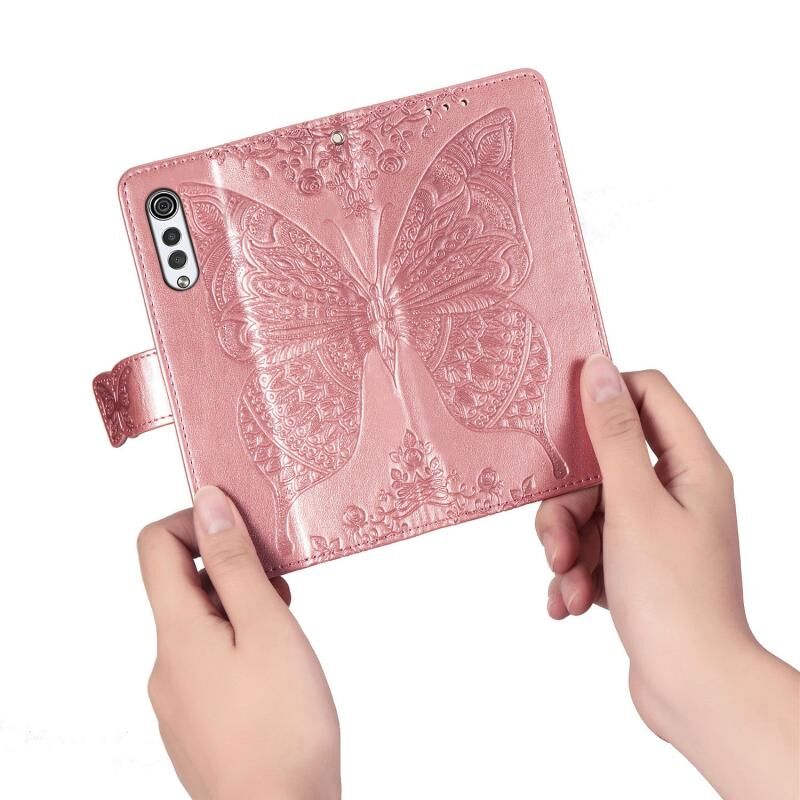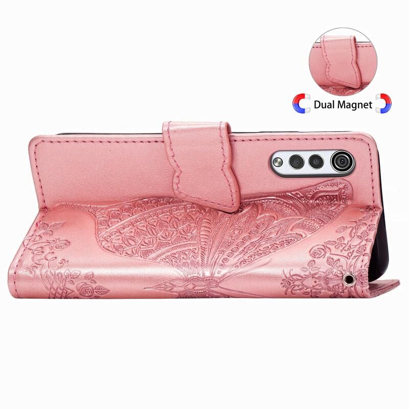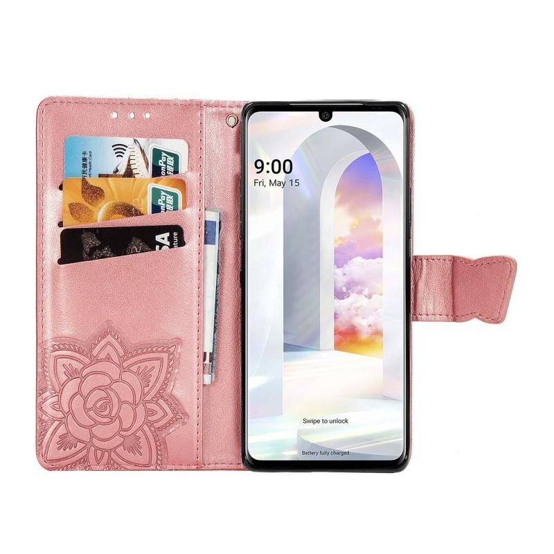 Θήκη δέρματος οριζόντιας αναδίπλωσης με ανάγλυφο σχέδιο πεταλούδας, λουλούδια, βάση στήριξης, θήκες για κάρτες, πορτοφόλι και λουρί για LG Velvet 2 Pro (Μαύρο)