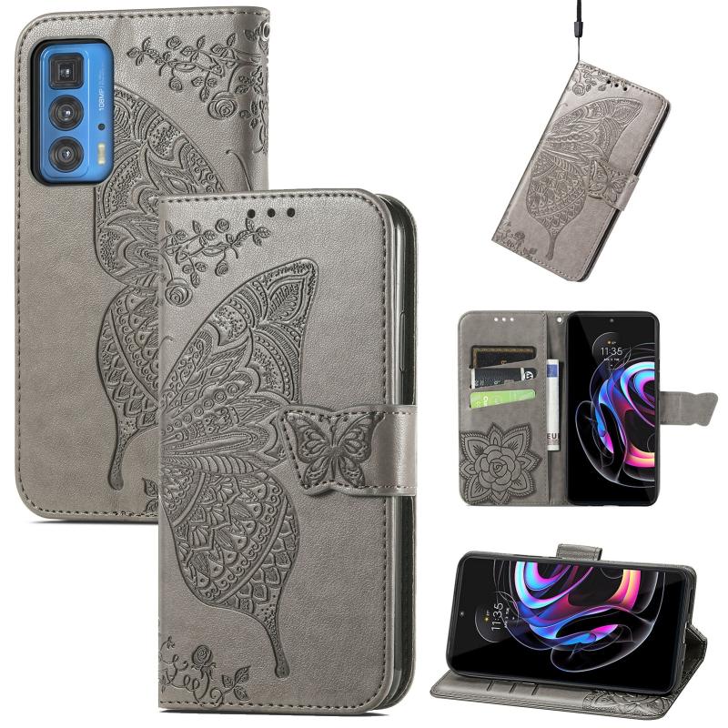 Θήκη δέρματος οριζόντιας αναδίπλωσης με σχέδιο πεταλούδας, λουλούδια, ανάγλυφο, με βάση & θήκες καρτών & πορτοφόλι & λουρί για Motorola Edge 20 Pro (Σκούρο Μωβ)