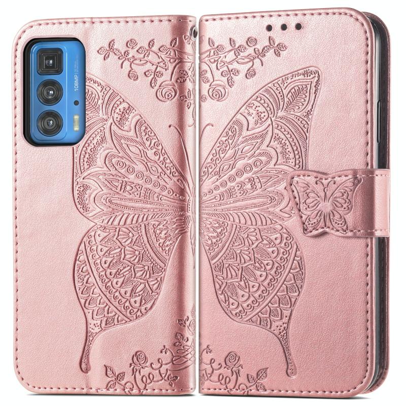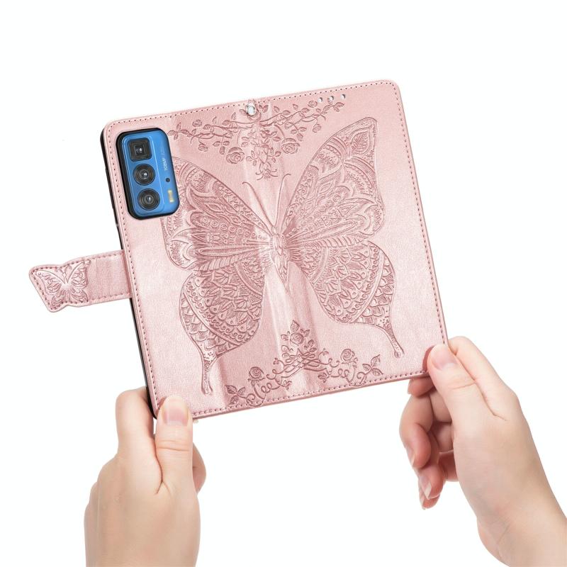 Θήκη δέρματος οριζόντιας αναδίπλωσης με σχέδιο πεταλούδας, λουλούδια, ανάγλυφο, με βάση & θήκες καρτών & πορτοφόλι & λουρί για Motorola Edge 20 Pro (Σκούρο Μωβ)