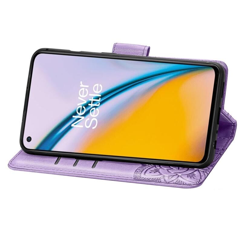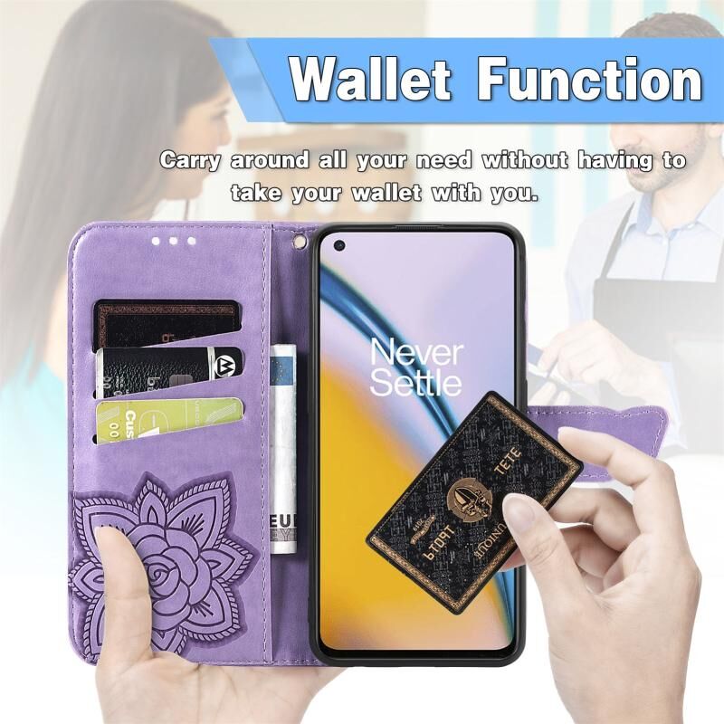 Θήκη δέρματος οριζόντιας αναδίπλωσης με σχέδιο πεταλούδας, λουλούδια, ανάγλυφο, με βάση & υποδοχές καρτών & πορτοφόλι & λουρί για OnePlus Nord 2 5G (Μαύρο)