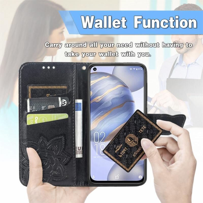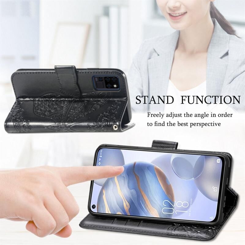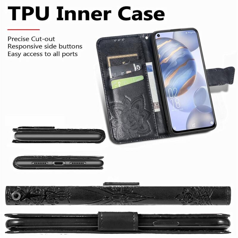 Θήκη δέρματος οριζόντιας αναδίπλωσης με σχέδιο πεταλούδας, λουλούδια, ανάγλυφο, με βάση & υποδοχές καρτών & πορτοφόλι & λουρί για Oukitel C21 (Μαύρο)