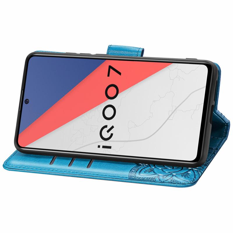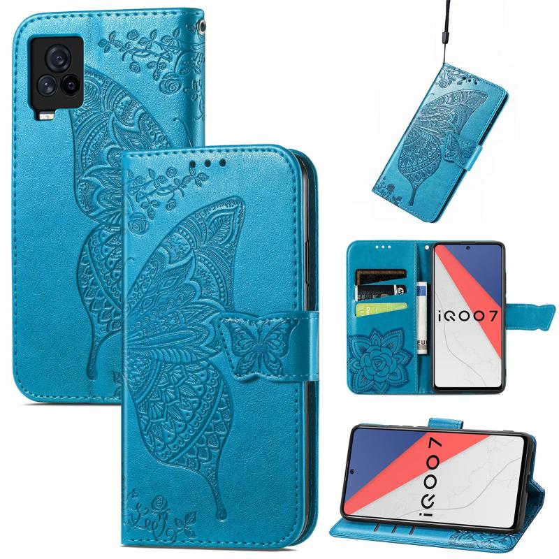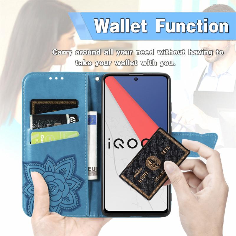 Θήκη δέρματος οριζόντιας αναδίπλωσης με ανάγλυφο σχέδιο πεταλούδας, λουλούδια, βάση στήριξης, θήκες για κάρτες, πορτοφόλι και λουρί για vivo IQOO 7 (Σκούρο Μωβ)