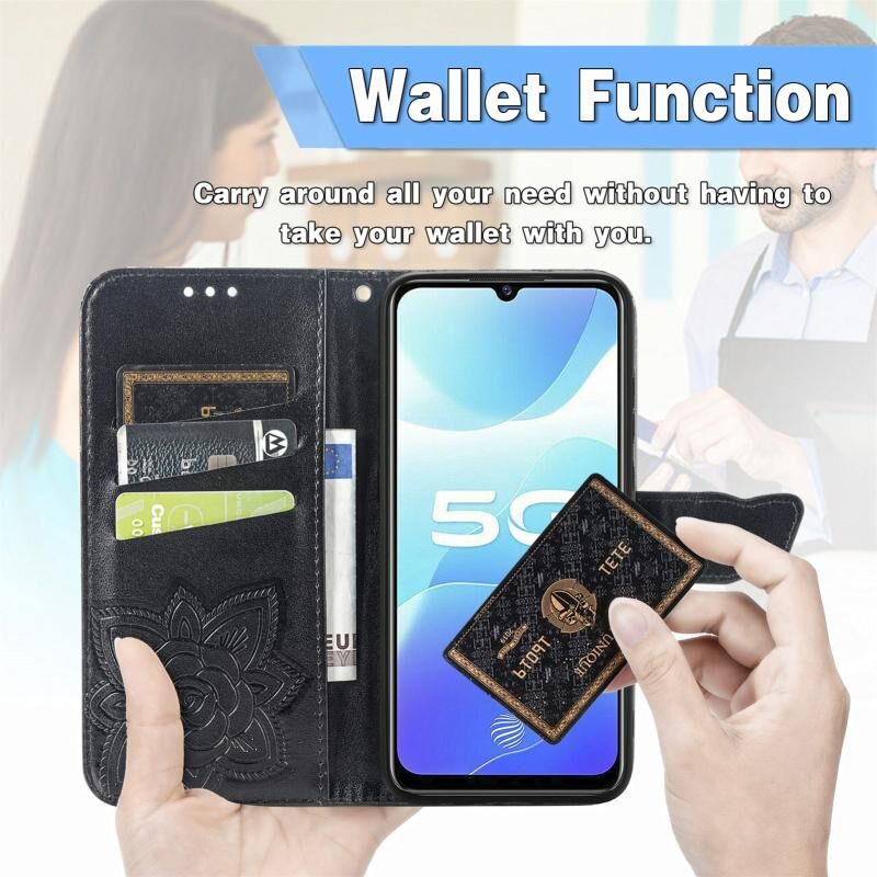Θήκη δέρματος οριζόντιας αναδίπλωσης με ανάγλυφο σχέδιο πεταλούδας, λουλούδια, βάση στήριξης, θήκες για κάρτες, πορτοφόλι και λουρί για vivo S7e (Μαύρο)