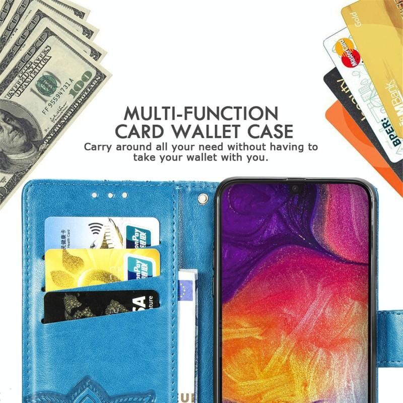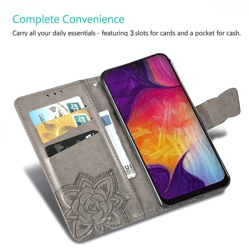 Πεταλούδα αγάπη λουλούδια ανάγλυφη οριζόντια Flip δερμάτινη θήκη για Galaxy A50, με θήκη & υποδοχές για κάρτες & πορτοφόλι & κορδόνι (Μαύρο)