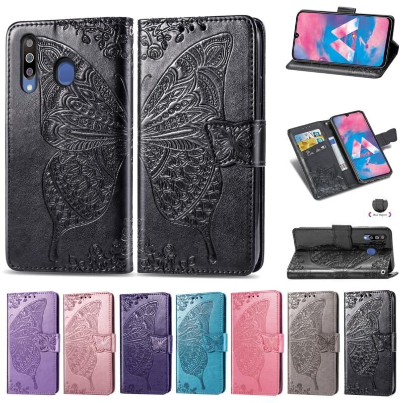 Θήκη δέρματος οριζόντιας ανατροπής με σχέδιο πεταλούδας, λουλούδια και ανάγλυφο για Galaxy M30 με βάση, θήκες καρτών, πορτοφόλι και λουρί (Μαύρο)