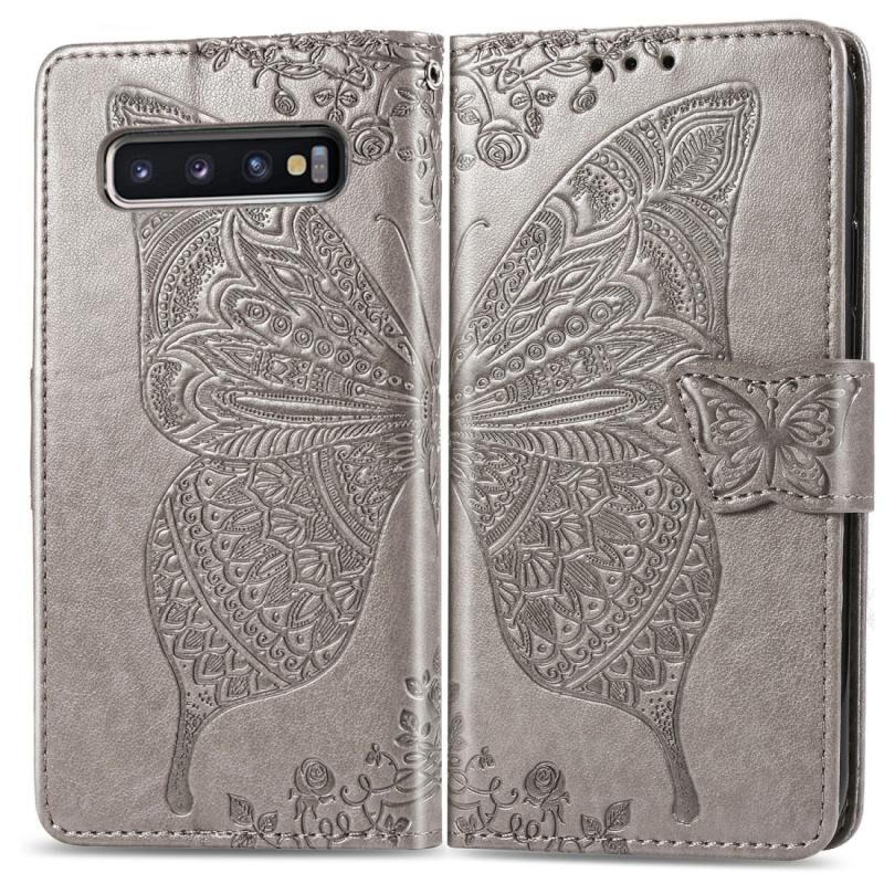 Πεταλούδα αγάπη λουλούδια ανάγλυφη οριζόντια Flip δερμάτινη θήκη για Galaxy S10, με θήκη & υποδοχές για κάρτες & πορτοφόλι & κορδόνι (γκρι)