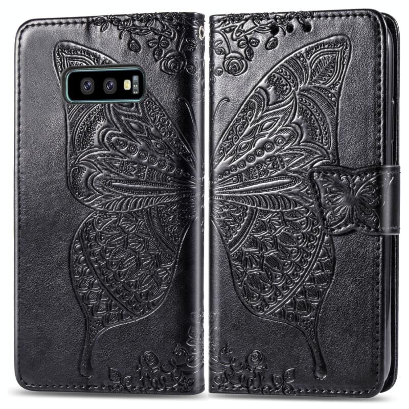 Πεταλούδα αγάπη λουλούδια ανάγλυφη οριζόντια Flip δερμάτινη θήκη για Galaxy S10e, με θήκη & υποδοχές για κάρτες & πορτοφόλι & κορδόνι (Μαύρο)