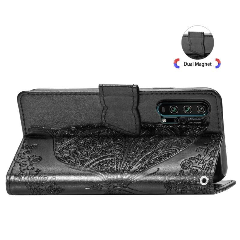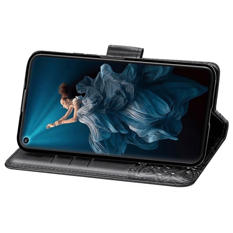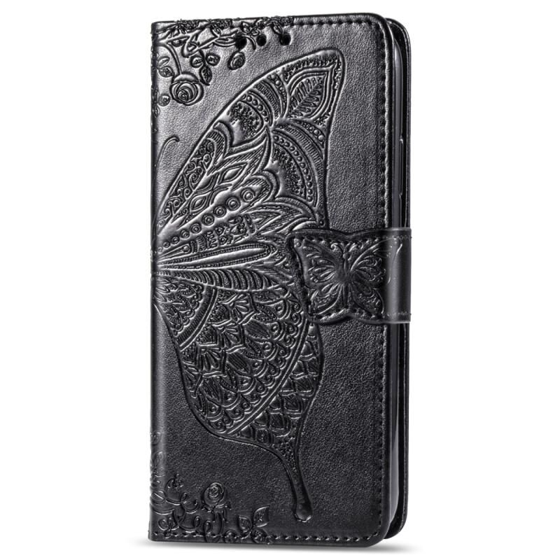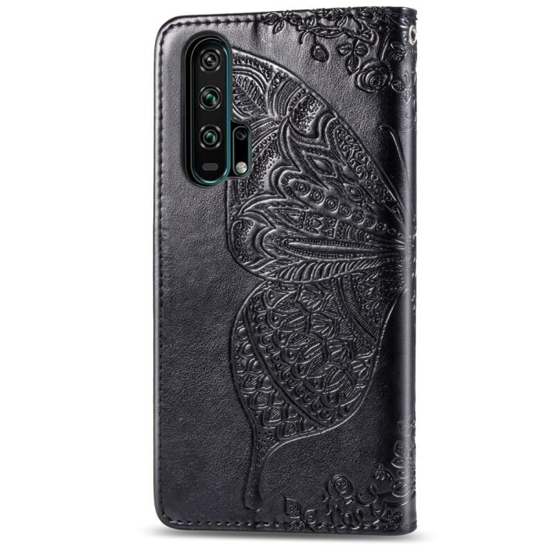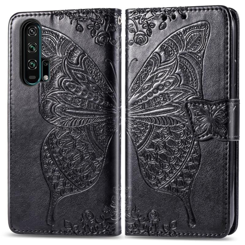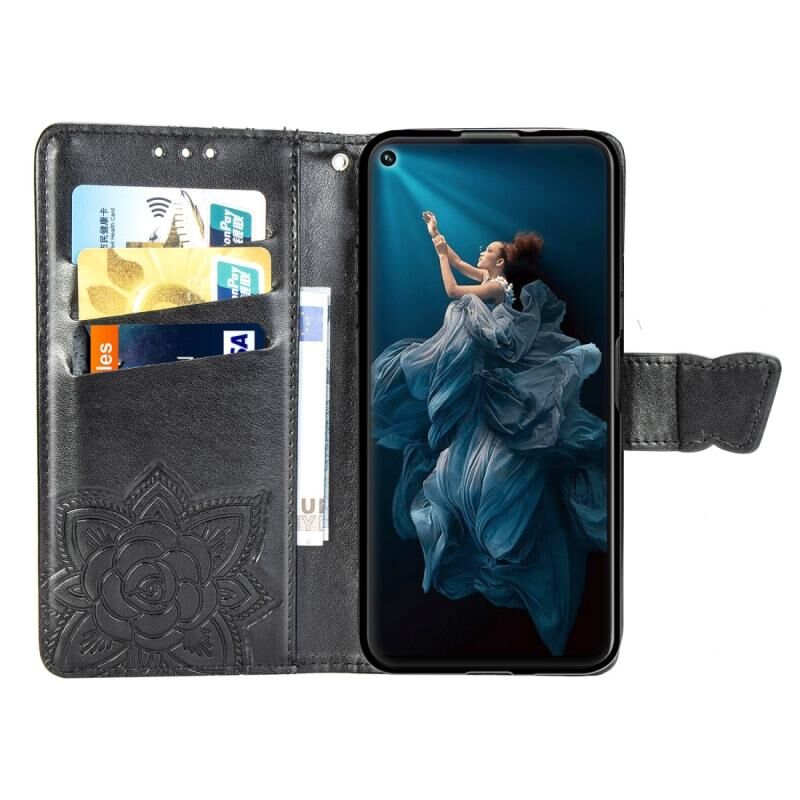Θήκη δέρματος οριζόντιας αναδίπλωσης για Huawei Honor 20 Pro με σχέδιο πεταλούδας, λουλουδιών και ανάγλυφο, με βάση, θήκες καρτών, πορτοφόλι και λουρί (Μαύρο)