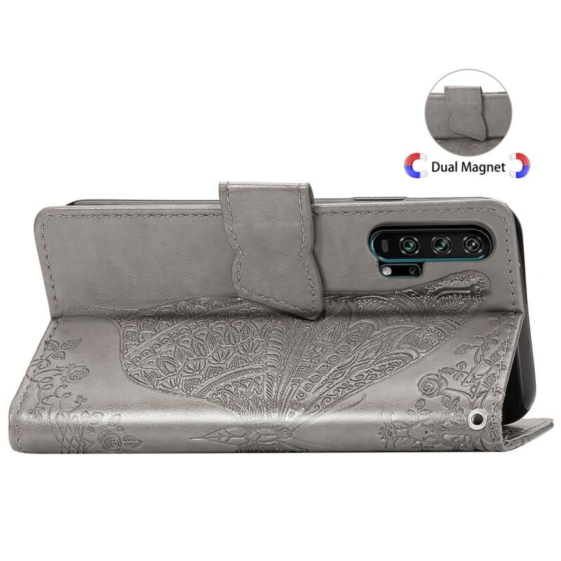 Θήκη δέρματος οριζόντιας αναδίπλωσης για Huawei Honor 20 Pro με σχέδιο πεταλούδας, λουλουδιών και ανάγλυφο, με βάση, θήκες καρτών, πορτοφόλι και λουρί (Μπλε)