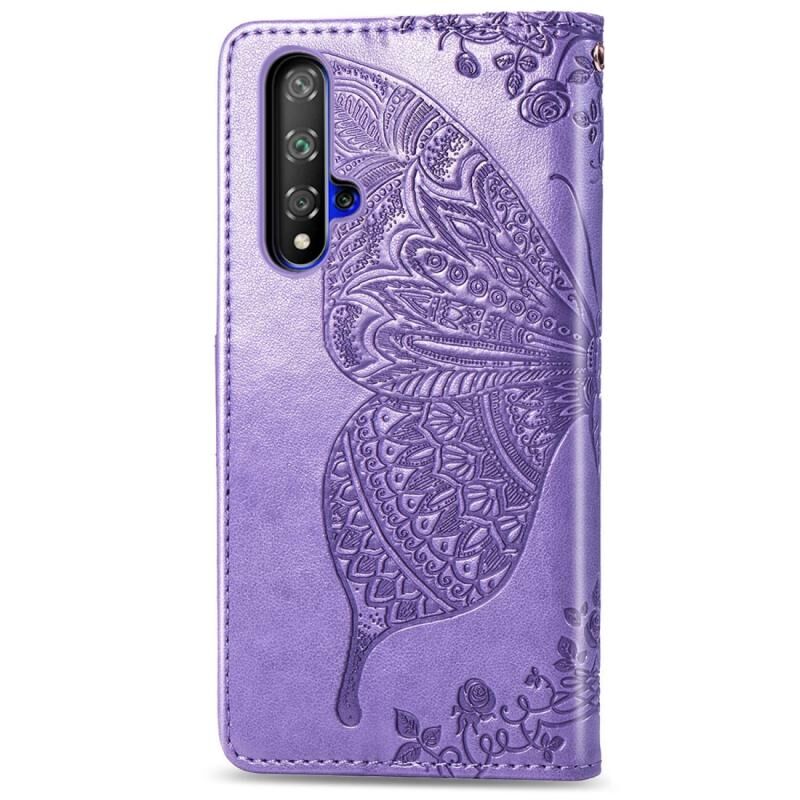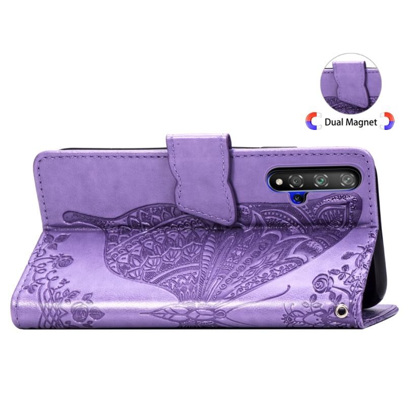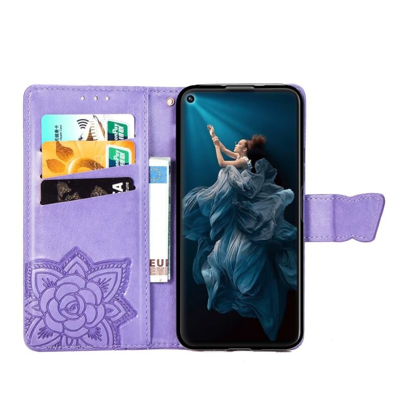 Θήκη δέρματος οριζόντιας αναδίπλωσης για Huawei Honor 20 με σχέδιο πεταλούδας, λουλουδιών και ανάγλυφο, με βάση, θήκες καρτών, πορτοφόλι και λουρί (Μαύρο)