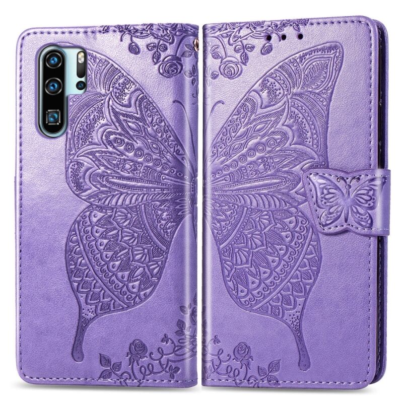 Πεταλούδα αγάπη λουλούδια ανάγλυφη οριζόντια Flip δερμάτινη θήκη για Huawei P30 Pro, με θήκη & υποδοχές για κάρτες & πορτοφόλι & κορδόνι (ανοιχτό μοβ)