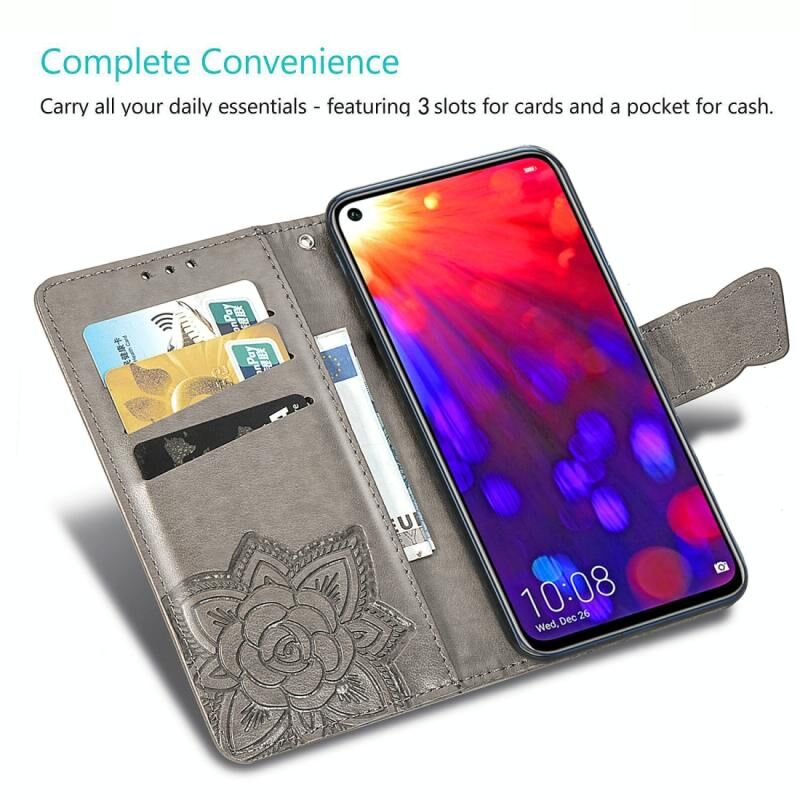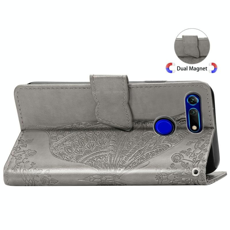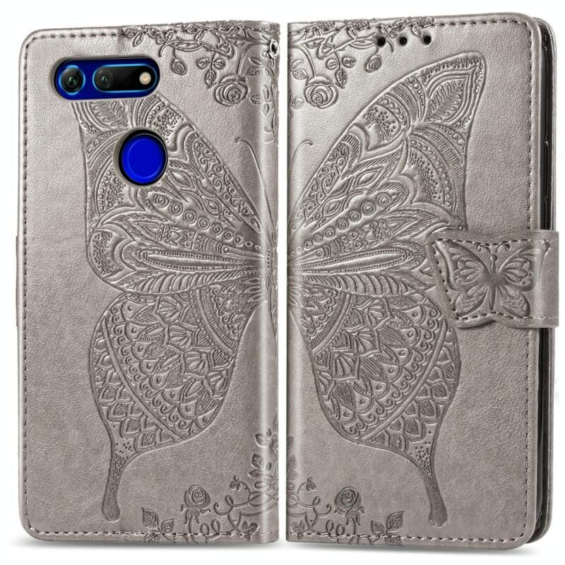 Πεταλούδα αγάπη λουλούδια ανάγλυφη οριζόντια Flip δερμάτινη θήκη για Huawei V20, με θήκη & υποδοχές για κάρτες & πορτοφόλι & κορδόνι (γκρι)
