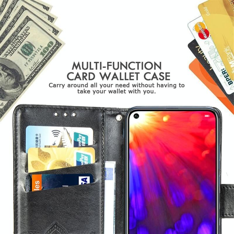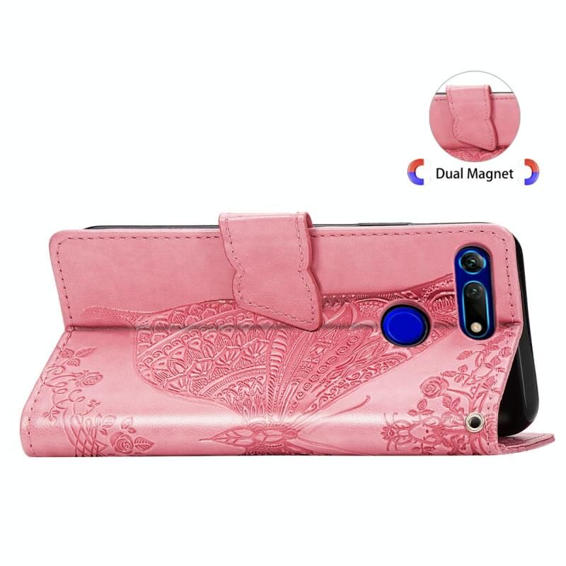 Πεταλούδα αγάπη λουλούδια ανάγλυφη οριζόντια Flip δερμάτινη θήκη για Huawei V20, με θήκη & υποδοχές για κάρτες & πορτοφόλι & κορδόνι (ροζ)