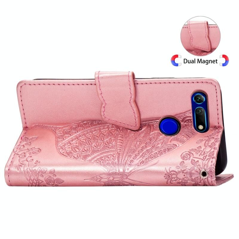 Πεταλούδα αγάπη λουλούδια ανάγλυφη οριζόντια Flip δερμάτινη θήκη για Huawei V20, με θήκη & υποδοχές για κάρτες & πορτοφόλι & κορδόνι (Rose Gold)