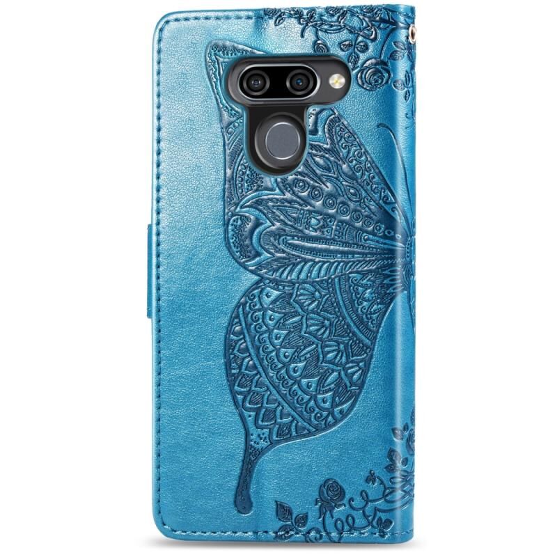 Πεταλούδα αγάπη λουλούδια ανάγλυφη οριζόντια Flip δερμάτινη θήκη για LG K50, με υποδοχές για κάρτες & υποδοχές & πορτοφόλι & κορδόνι (μπλε)